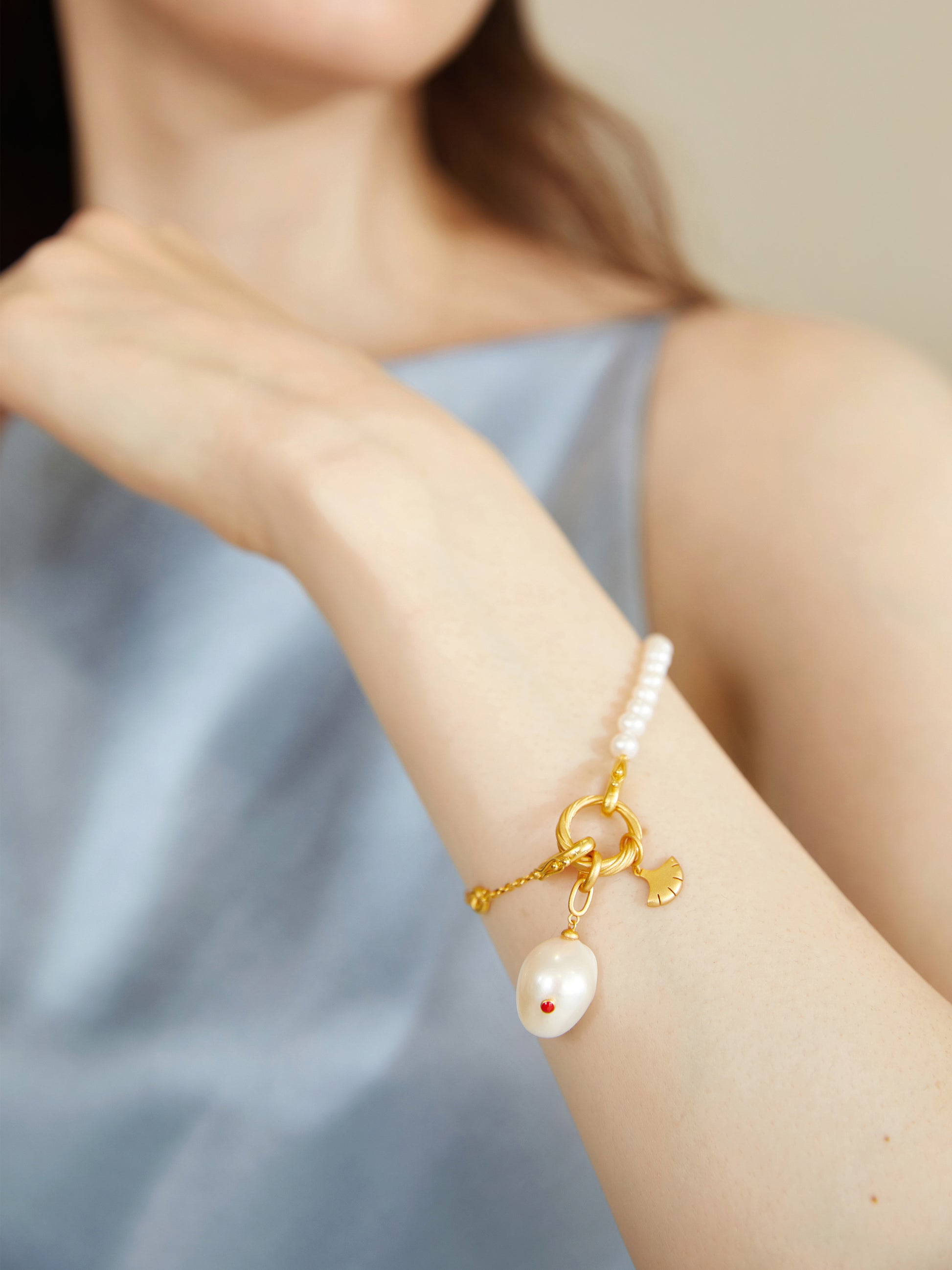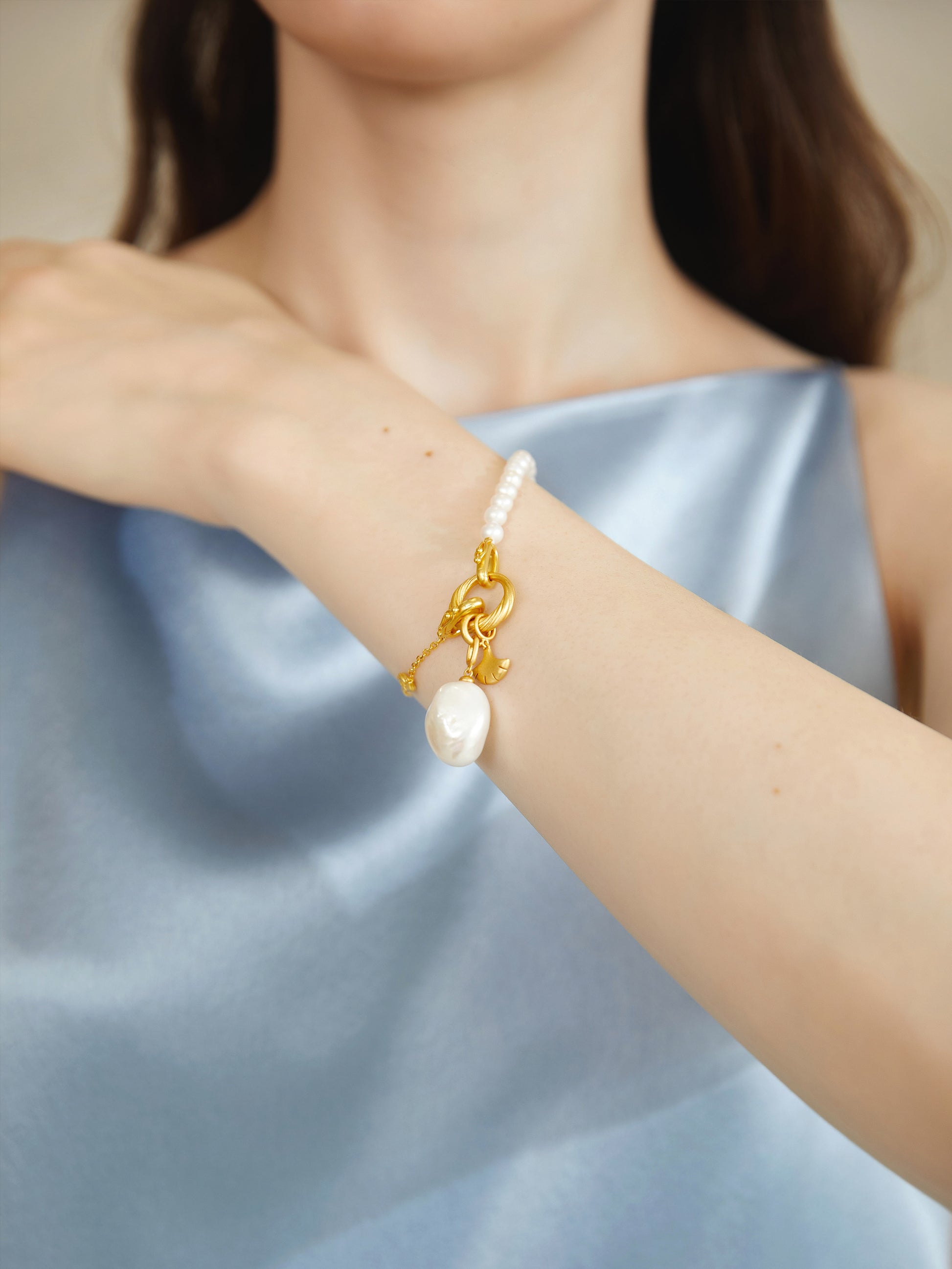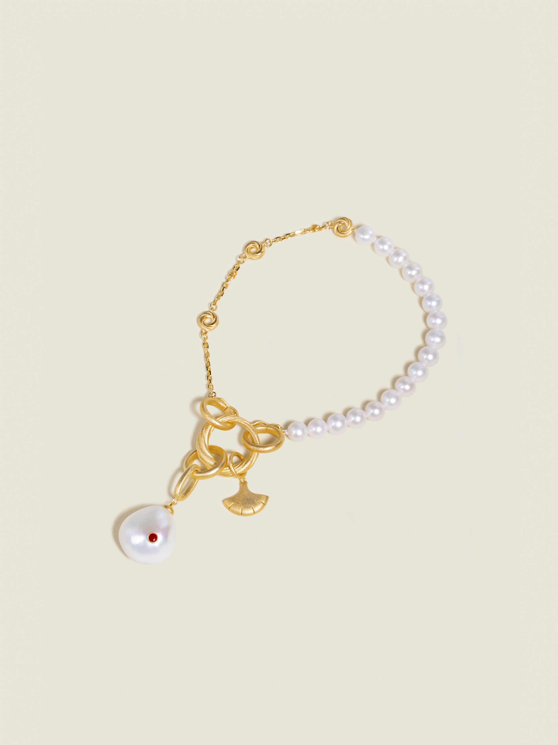 Introducing the Wave Asymmetrical Pearl Bracelet, inspired by the enchanting beauty of Lake Biwa. At its center is a wave-patterned gold pendant, intricately engraved to mirror the smooth, gentle essence of the lake as depicted in Mori Yuza's Hamonshu. This bracelet elegantly combines the charm of pearls with a fine gold chain, detailed with subtle wave motifs. Adorn yourself with timeless elegance and the tranquil grace of the waves.