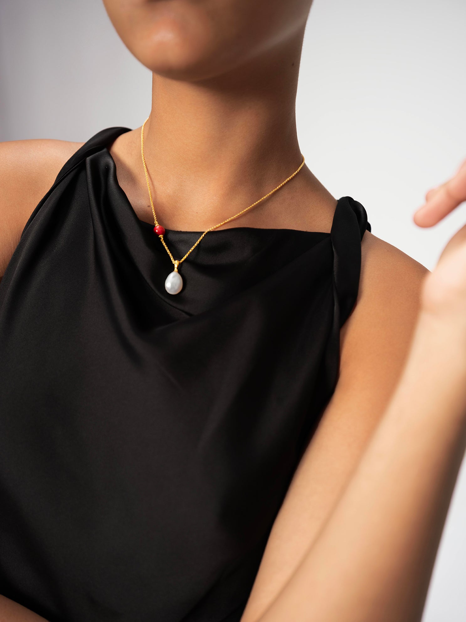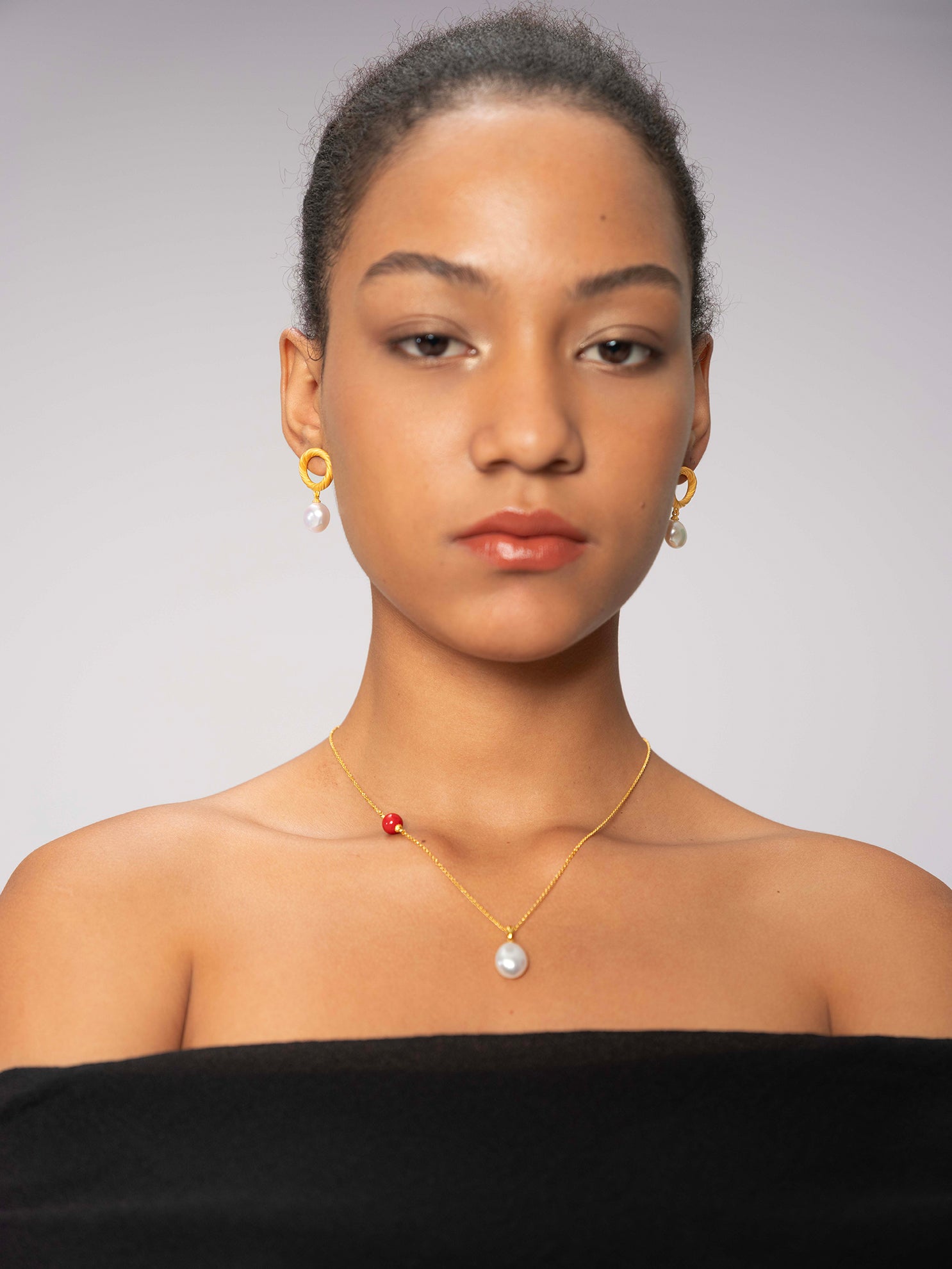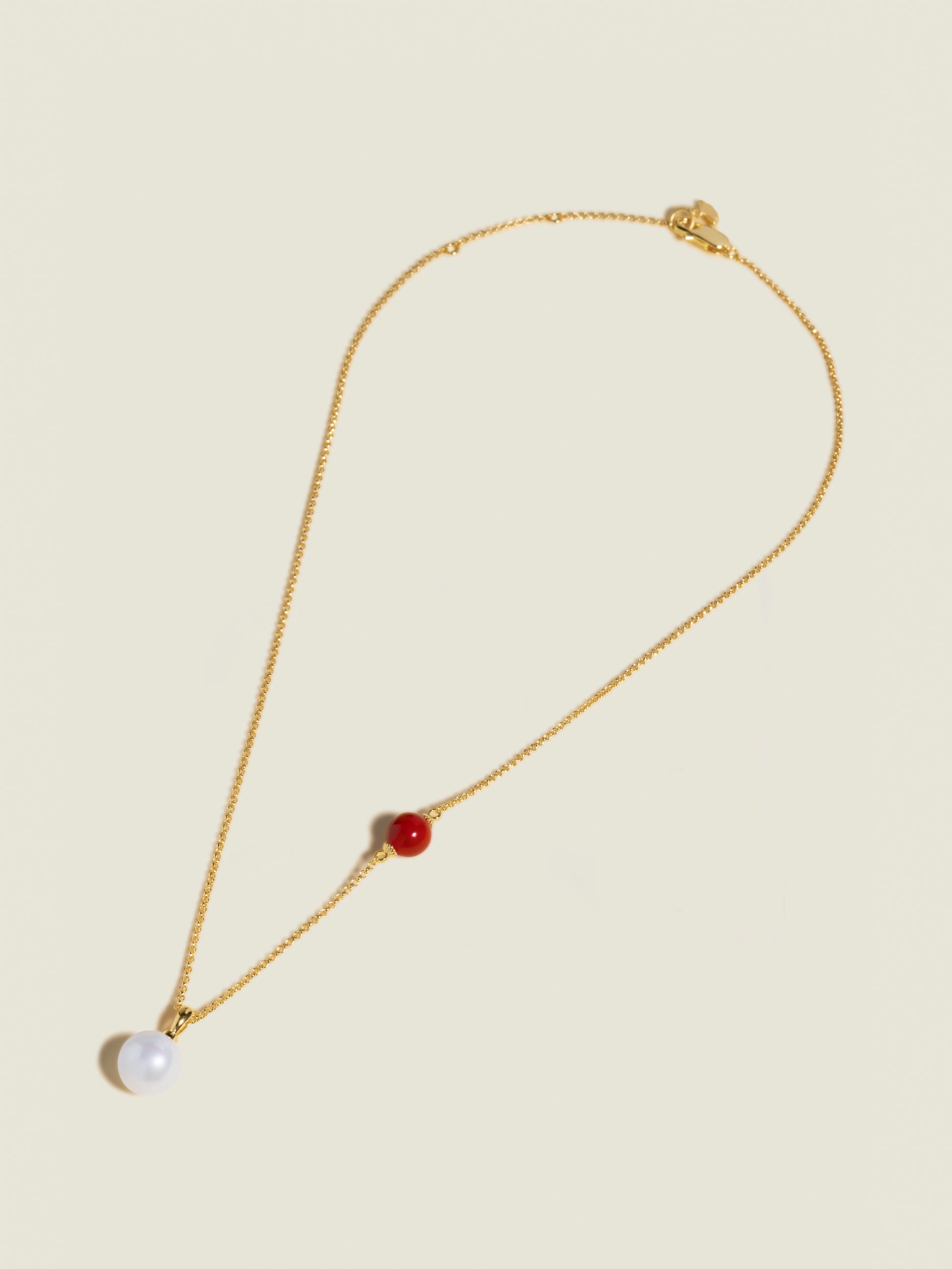 Dawn Clouds Pendant (曙の雲 / Akebono no Kumo), inspired by red clouds at dawn, blending the strength of red with the lightness of white clouds. The pendant feature both a lustrous pearl and a vibrant red lacquer bead. In Japanese culture, this design represents the beginning of a new era or the moment when new possibilities emerge, embodying the promise of fresh beginnings.