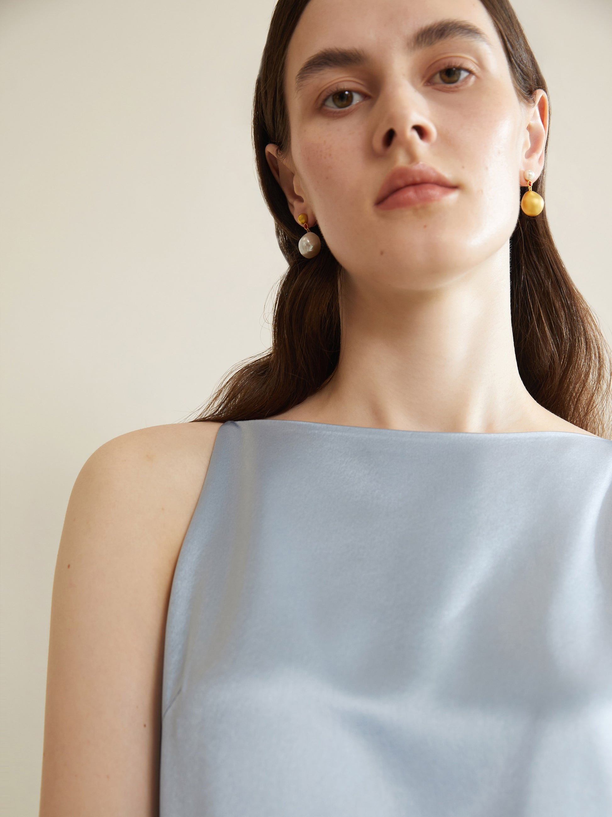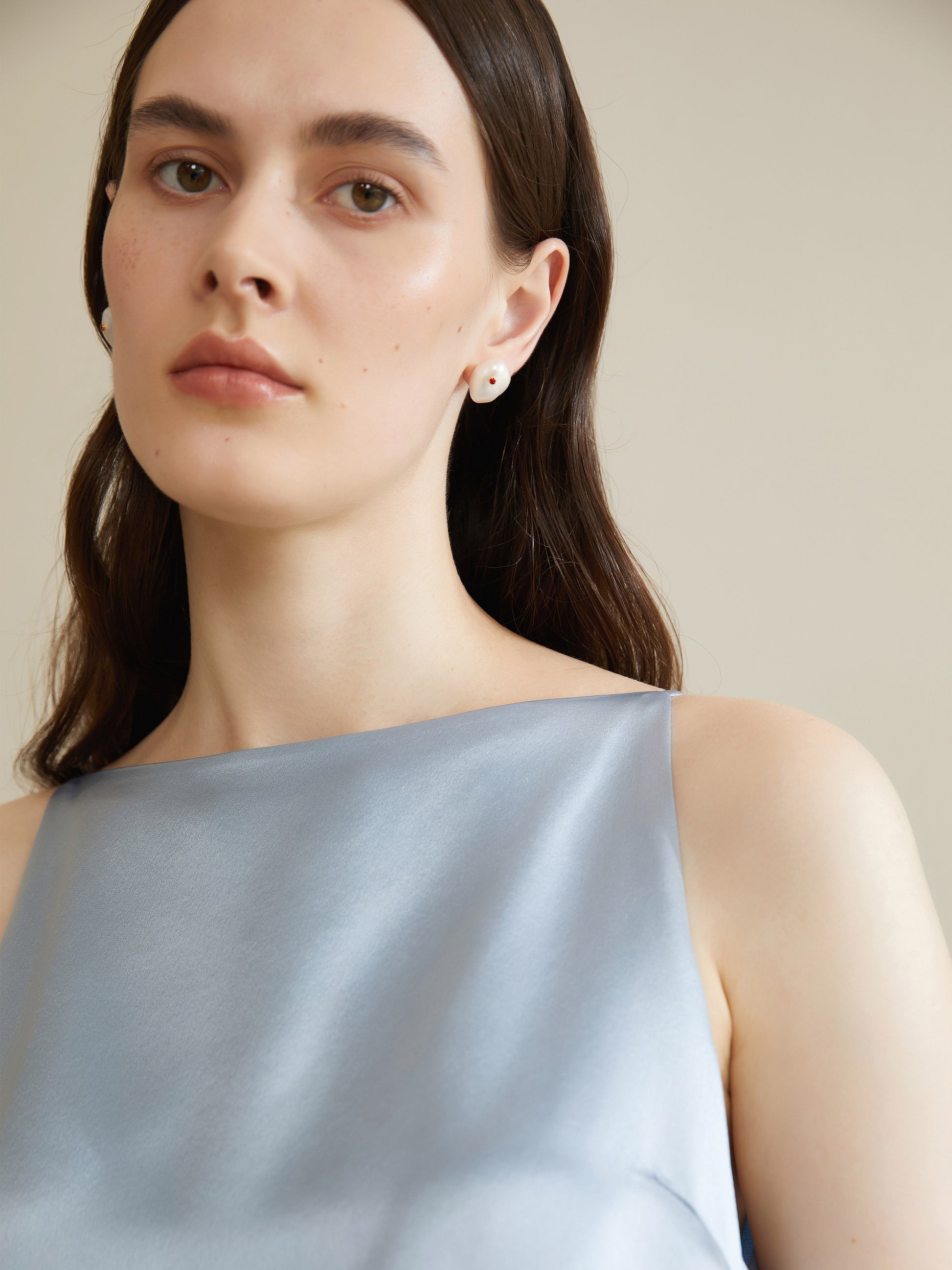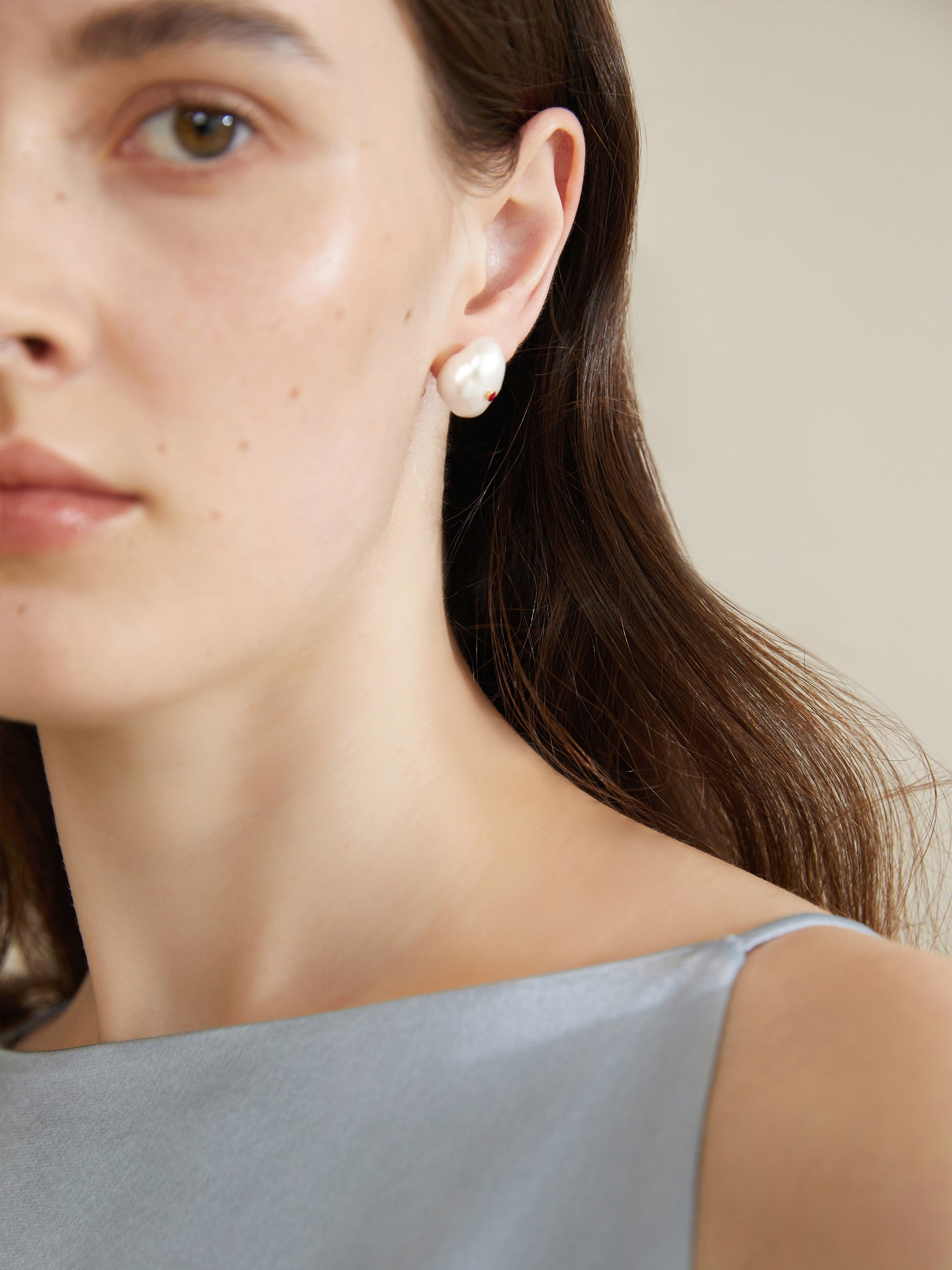 The Enamel Baroque Earrings showcase SHIRATAMA (White Jade) pearls, celebrated for their off-round shape and impressive luster. Each pearl enchants with a blend of gentle charm and wild allure, their unique, free-form shapes exemplifying the beauty of nature's imperfections. At the core of each pearl is an enigmatic touch—a rich, red enamel dot that boldly punctuates the design with a splash of color.