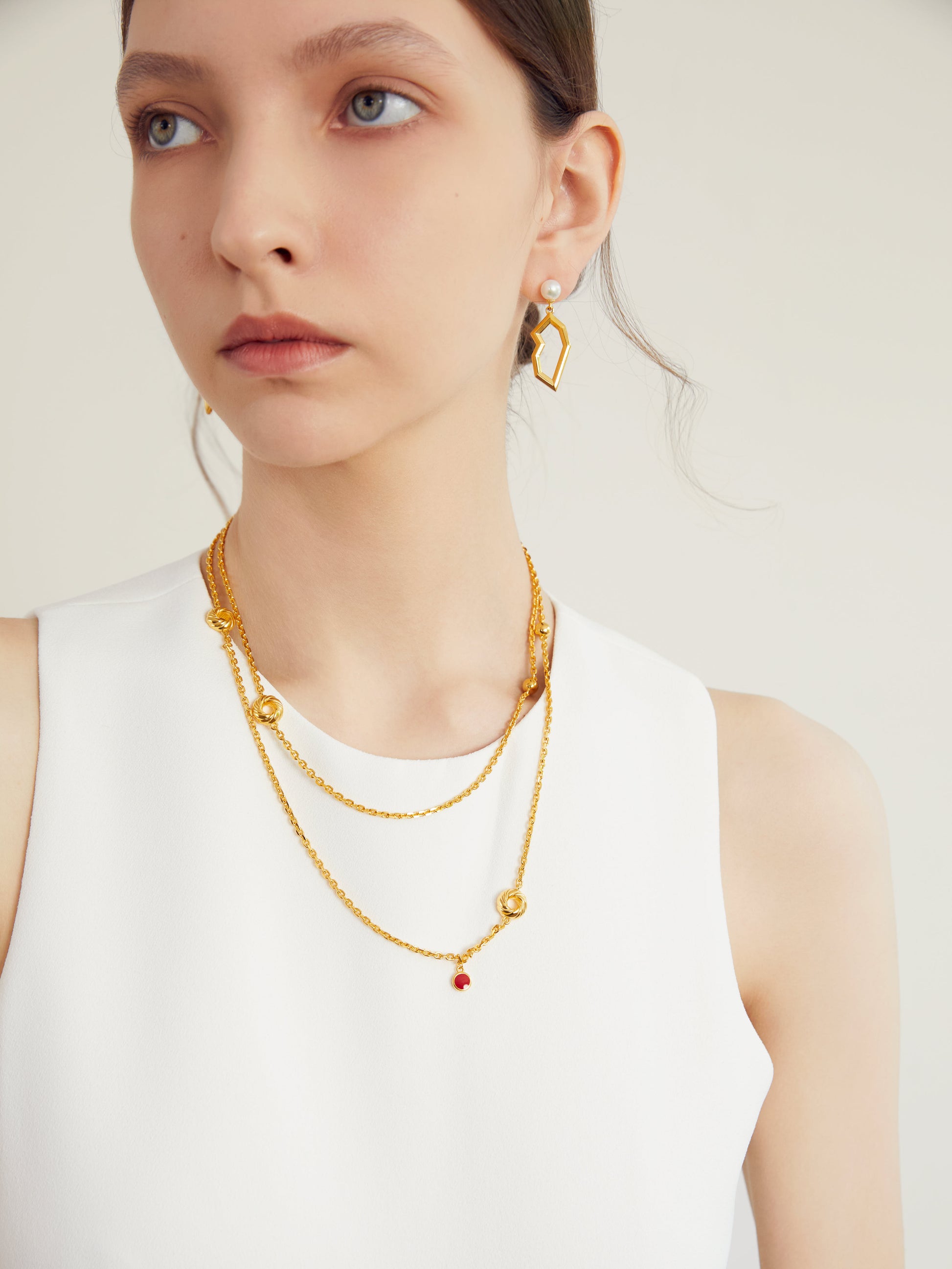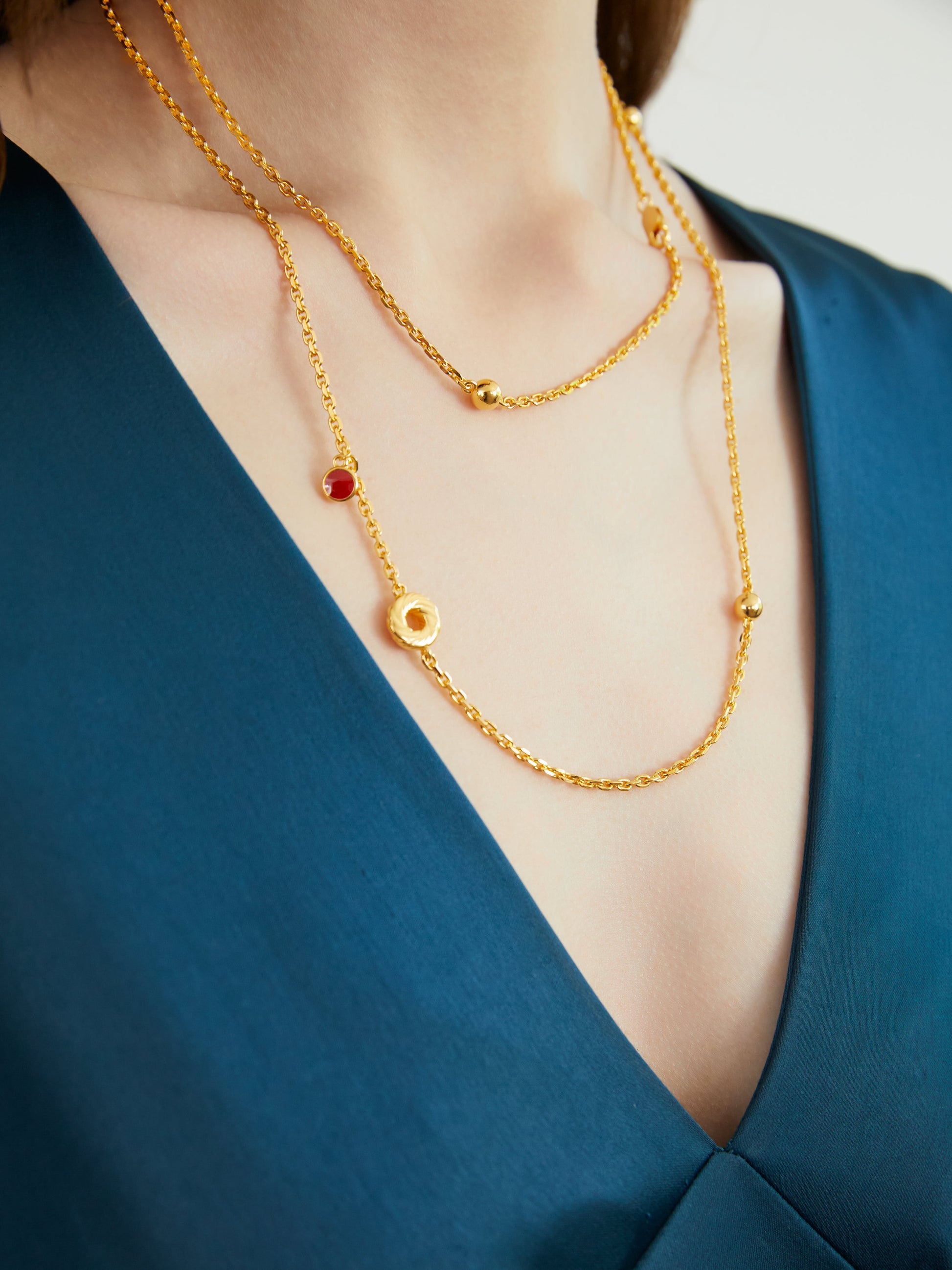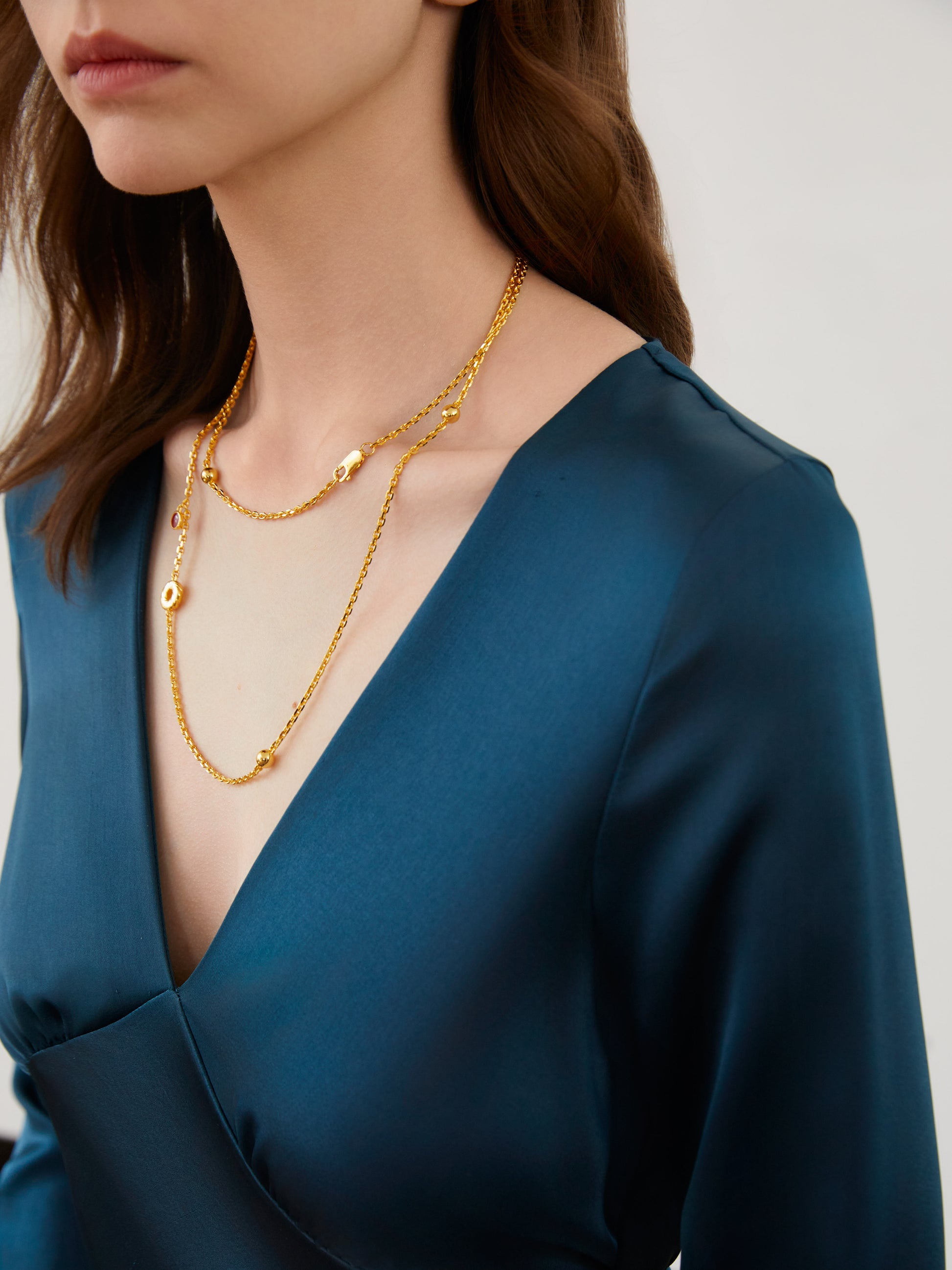 Delight in the whimsical asymmetry of the 'Golden Mosaic Enamel Charm Long Necklace', where playful design meets luxurious craftsmanship. This enchanting piece stretches 39 inches in length, adorned with an array of multicolored enamel charms that catch the eye with their vibrant hues and are elegantly strung on a chain of gleaming 24K gold vermeil. Each charm is placed in an intentionally uneven distribution, mimicking the natural randomness of a flower-strewn path or a constellation-studded night sky. The effect is one of joyful spontaneity, a charmingly eclectic addition to any wrist that speaks to the wearer's love of color and an artistic, carefree spirit. Whether worn alone for a statement of colorful joy or layered with other pieces for a bold, bohemian effect, this 'Golden Mosaic Enamel Charm Bracelet' is a testament to playful design and golden elegance.