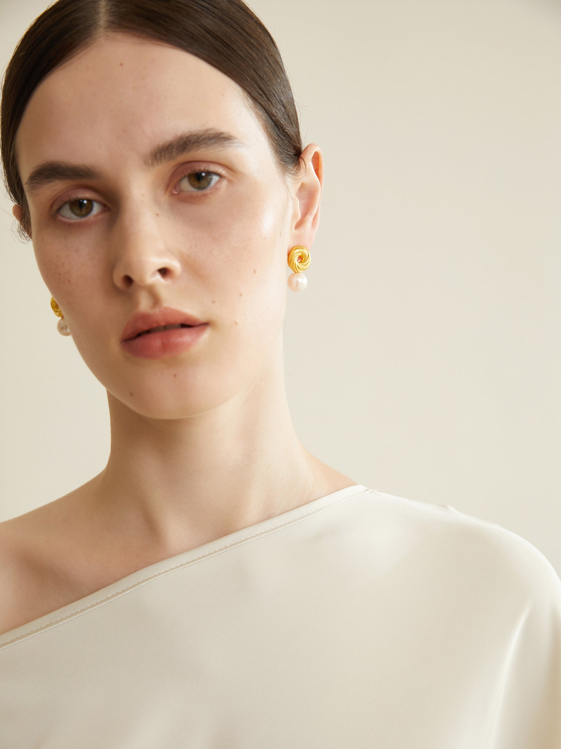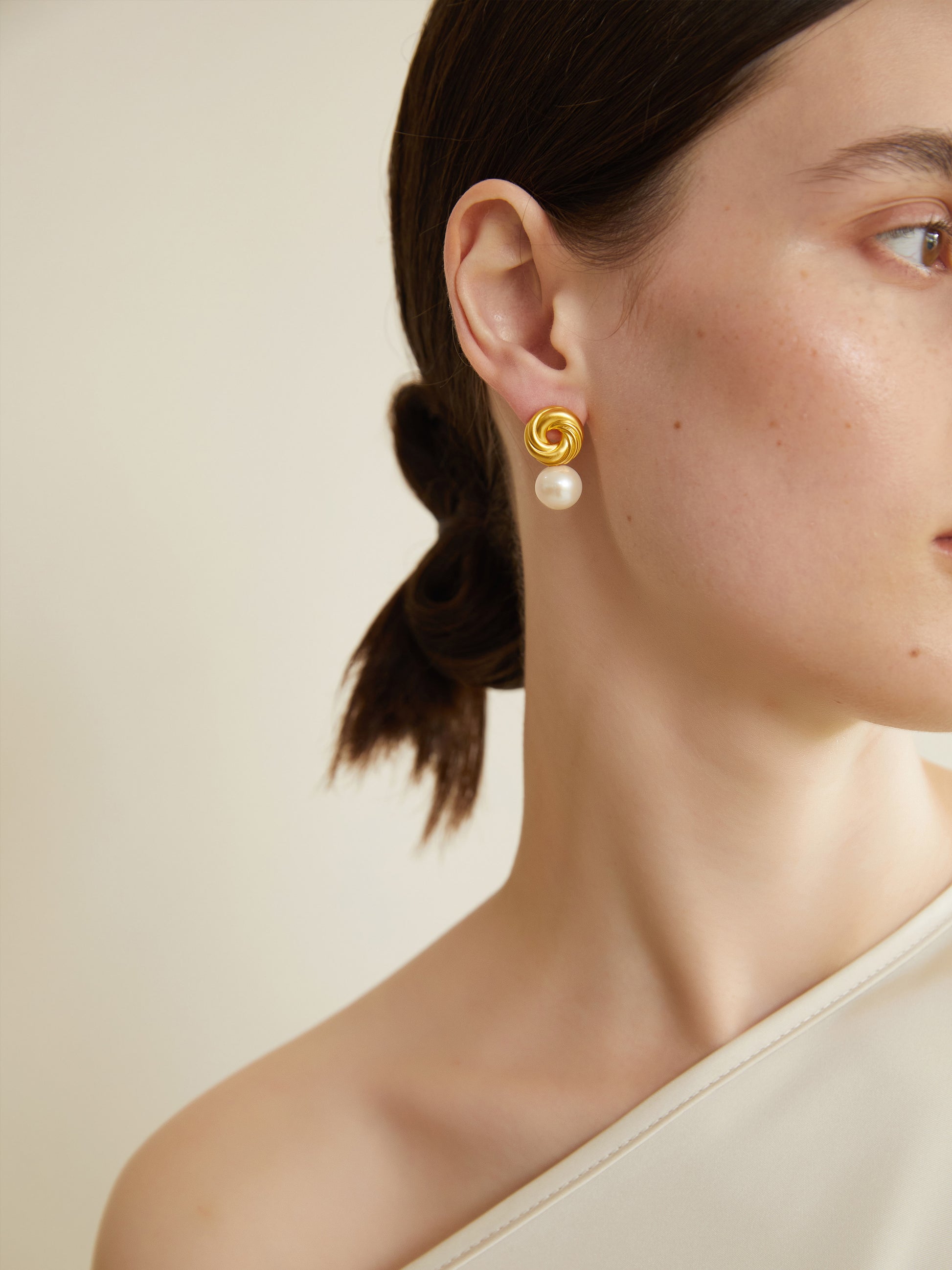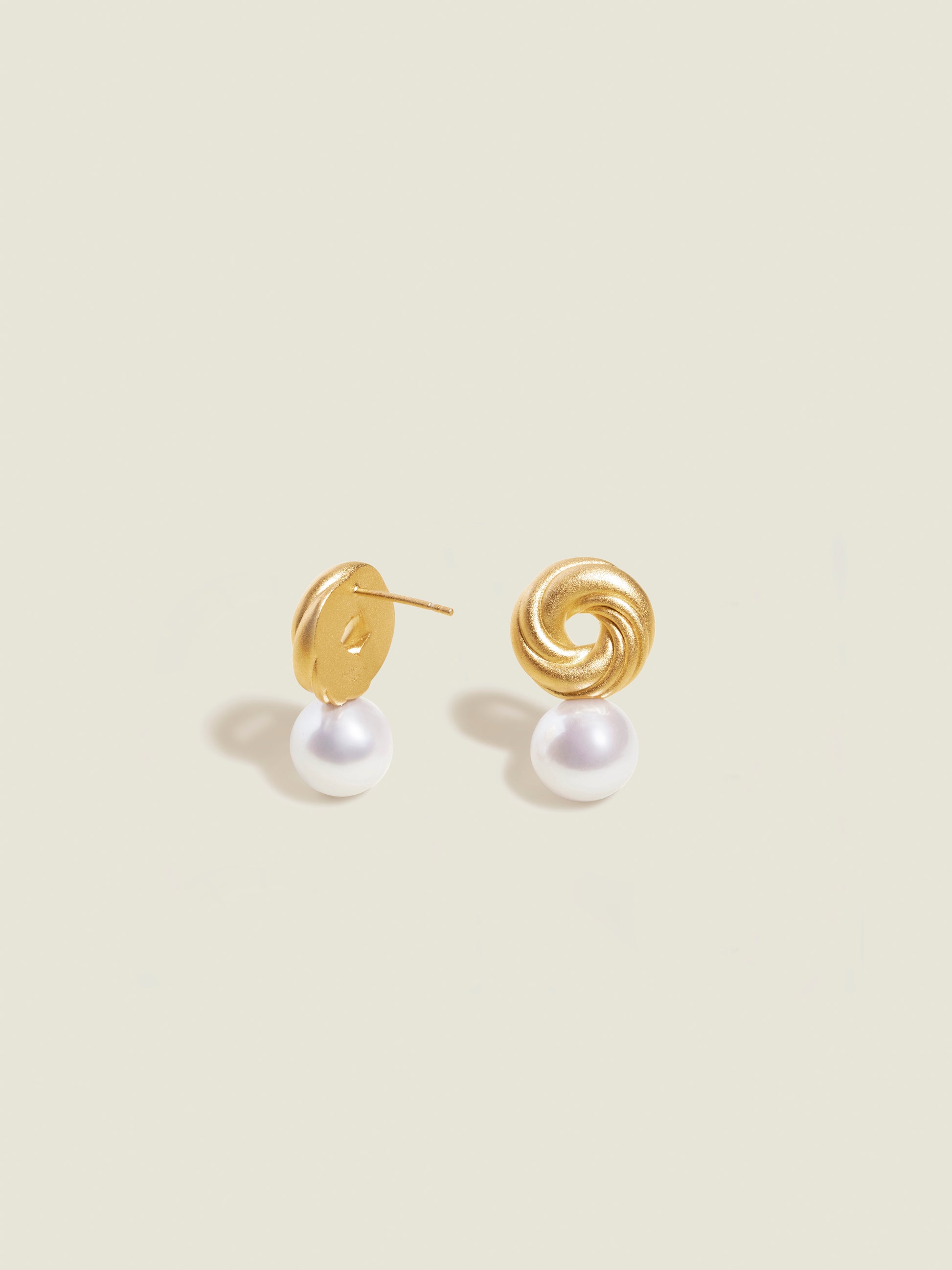 The WAVE Pearl Drop Earrings showcase a unique circular golden wave design inspired by the serene essence of Lake Biwa, as depicted in Mori Yuza's Hamonshu. Dangling from these dynamic twists are flawless pearls, gleaming with ethereal luminescence. Elevate your look with the refined elegance and tranquil allure of these timeless earrings.