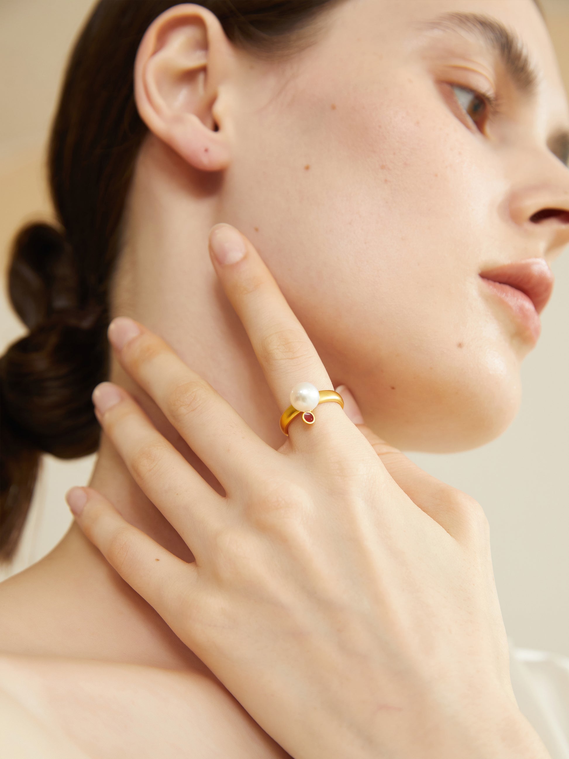 Introducing the Solitaire Pearl Enamel Ring, where the passionate BIWAKO Red meets the pristine white of the pearl. A lustrous pearl sits elegantly on the ring, with a circle of crimson enamel alongside, creating a perfect counterpoint to the pearl's gentle luminescence. This unique combination of passion and purity adds a touch of charm and vibrancy to your fingertips.