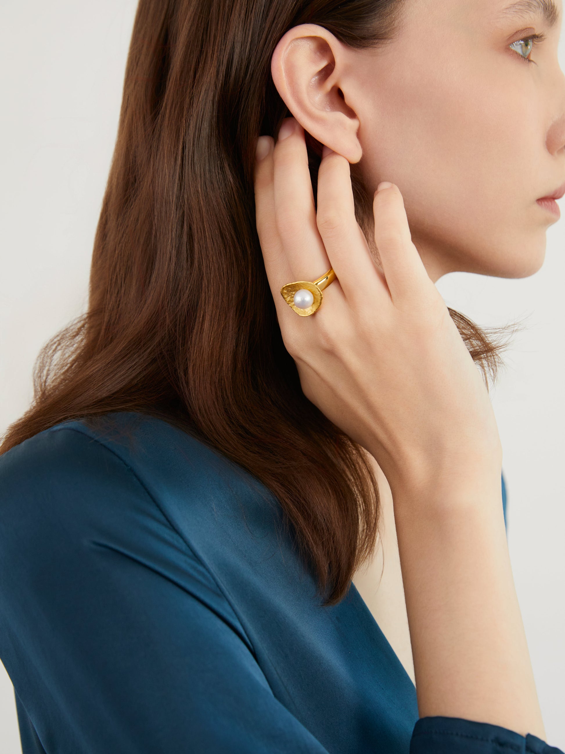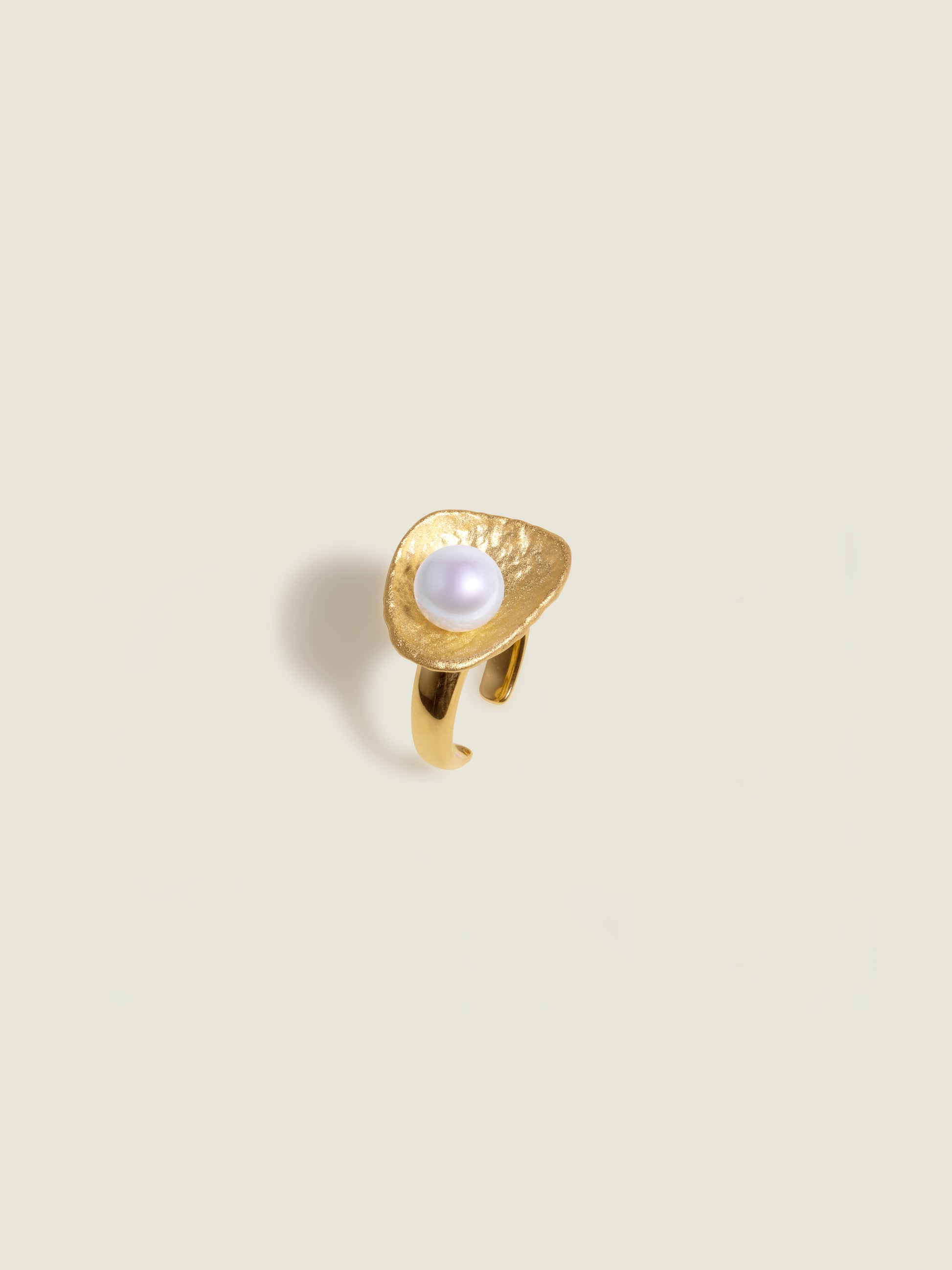 The Sunrise Pearl Ring draws inspiration from both the birth of a pearl and the rising sun over the sea. Encircled by a textured 24K gold vermeil band, symbolizing the nurturing embrace of both the mother shell and dawn's first light, a pearl sits at its center. The pearl's luster complements the intricate etchings of the gold, creating a harmonious contrast. This ring embodies renewal and vitality, merging nature's beauty with the energy of a new beginning.