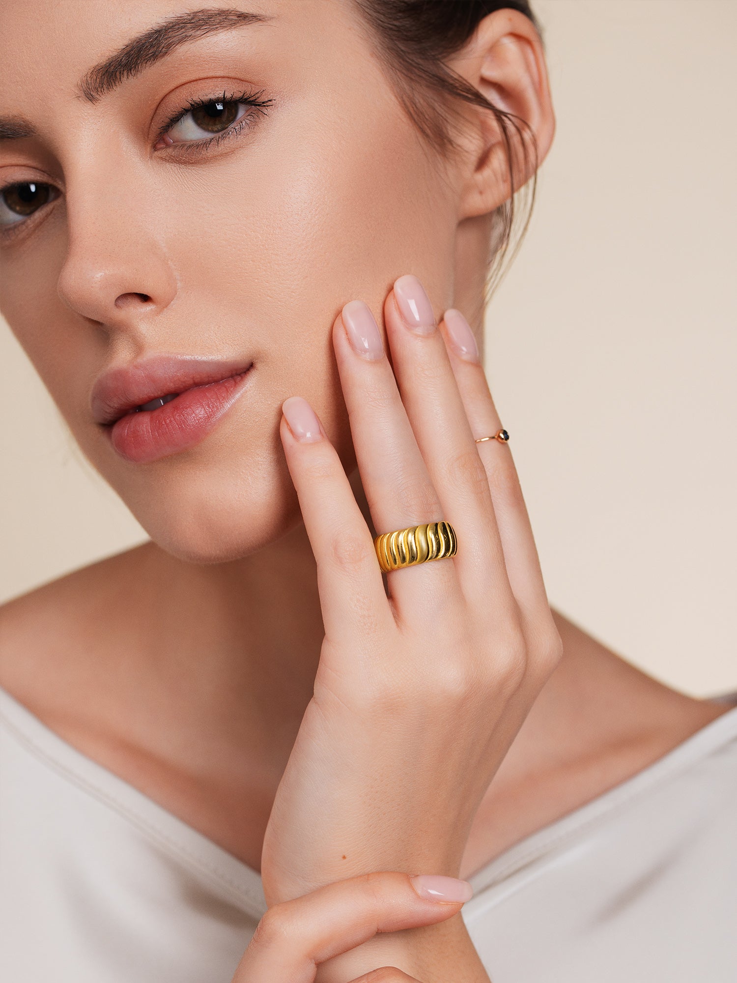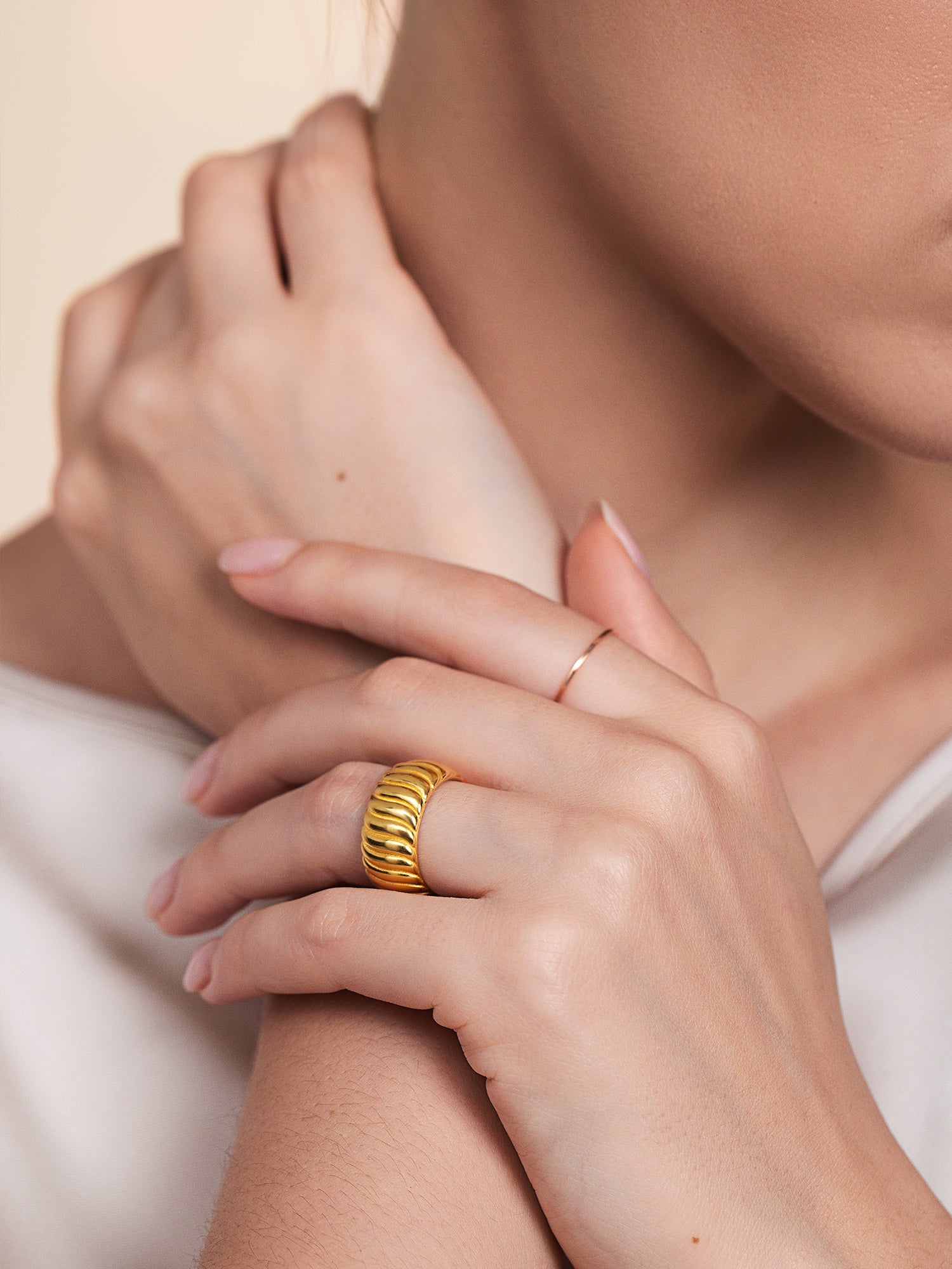 Inspired by the beauty of nature, this ring reflects the rhythmic motion of waves. The gracefully varying geometric curves, like the ever-changing tides, flow harmoniously across the band. Crafted from 24K gold-plated silver, its refined luster complements the delicate design, offering both a sense of rhythm and comfort.