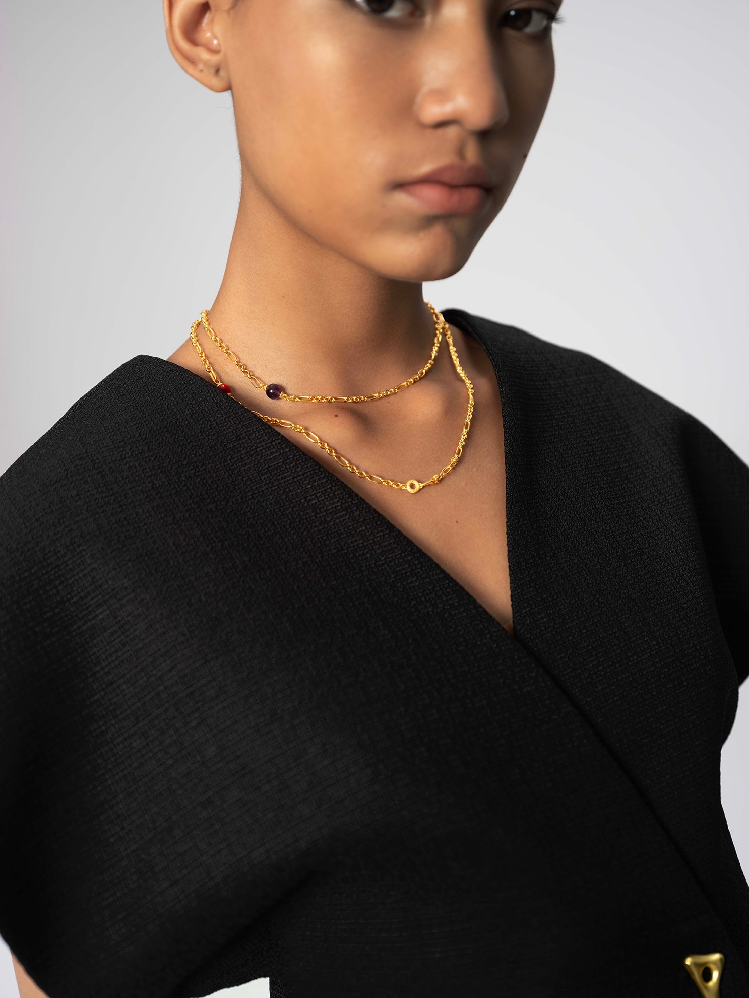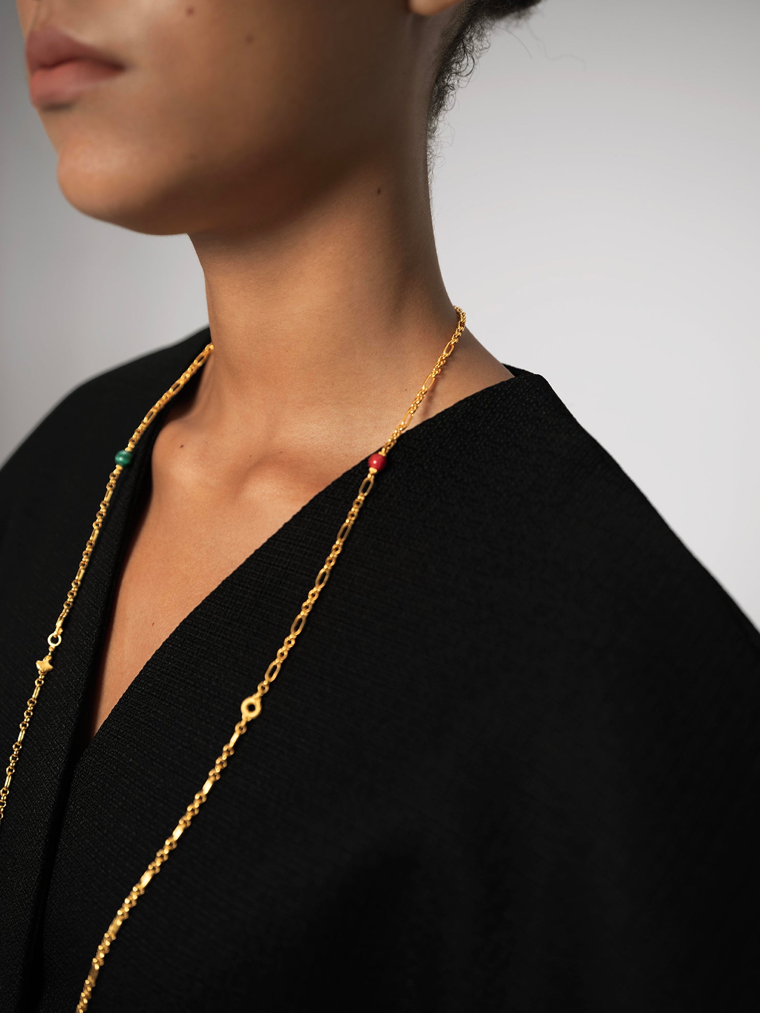Introducing the Dual Crystal Long Necklace, adorned with an assortment of Amethyst, Malachite and Japanese cinnabar lacquered basswood Ojime bead, which collectively foster spiritual growth and inner peace while boosting energy and vitality. This long necklace elegantly cascades down the chest, adding a dramatic flair and elongating the silhouette in any ensemble.